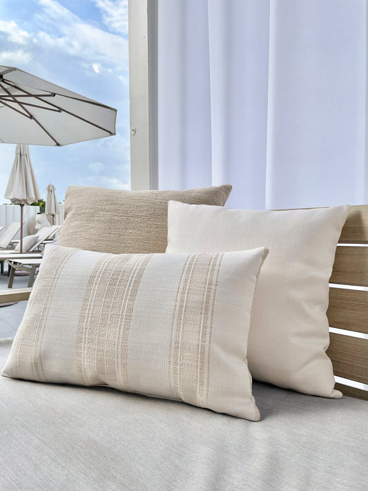 Beach Club Beige Stripe Indoor Outdoor Table Runner, Placemat, and Pillow Set