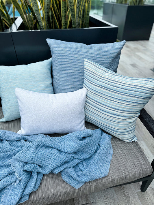 Blue Yacht Stripe Indoor Outdoor Table Runner, Placemats, and Pillows - PureAir Collection