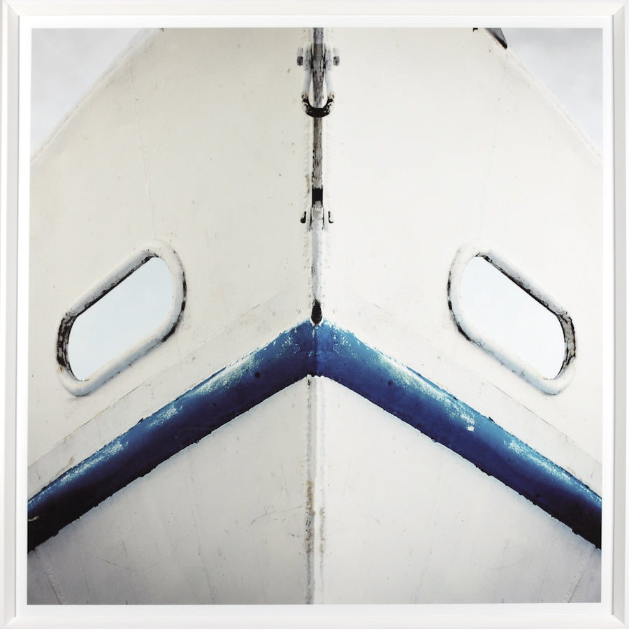 A dramatic coastal composition of clean whites and fresh deep blue make this hard working bow a stunner. framed in clean, white frame.
