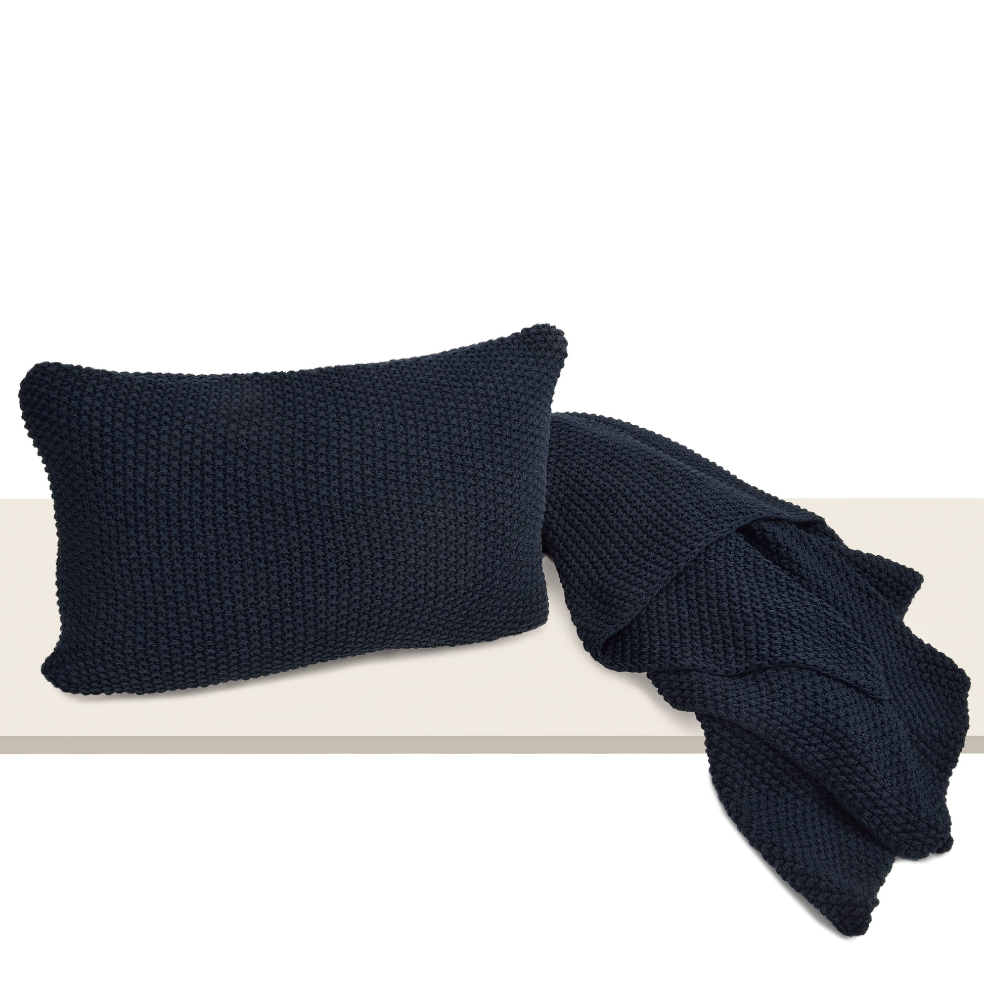 Our Jamie pillows and throw featured here in navy, has a classic knit that adds a casual yet sophisticated look to any space. Crafted from 100% cotton, it‘s also soft and cozy. The Jamie is a perfect combination of style and substance.