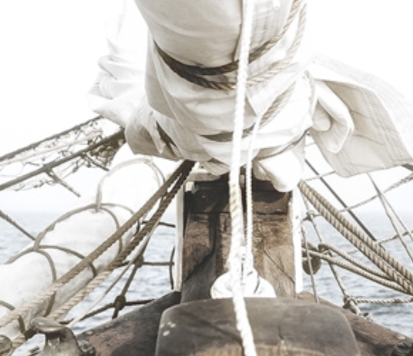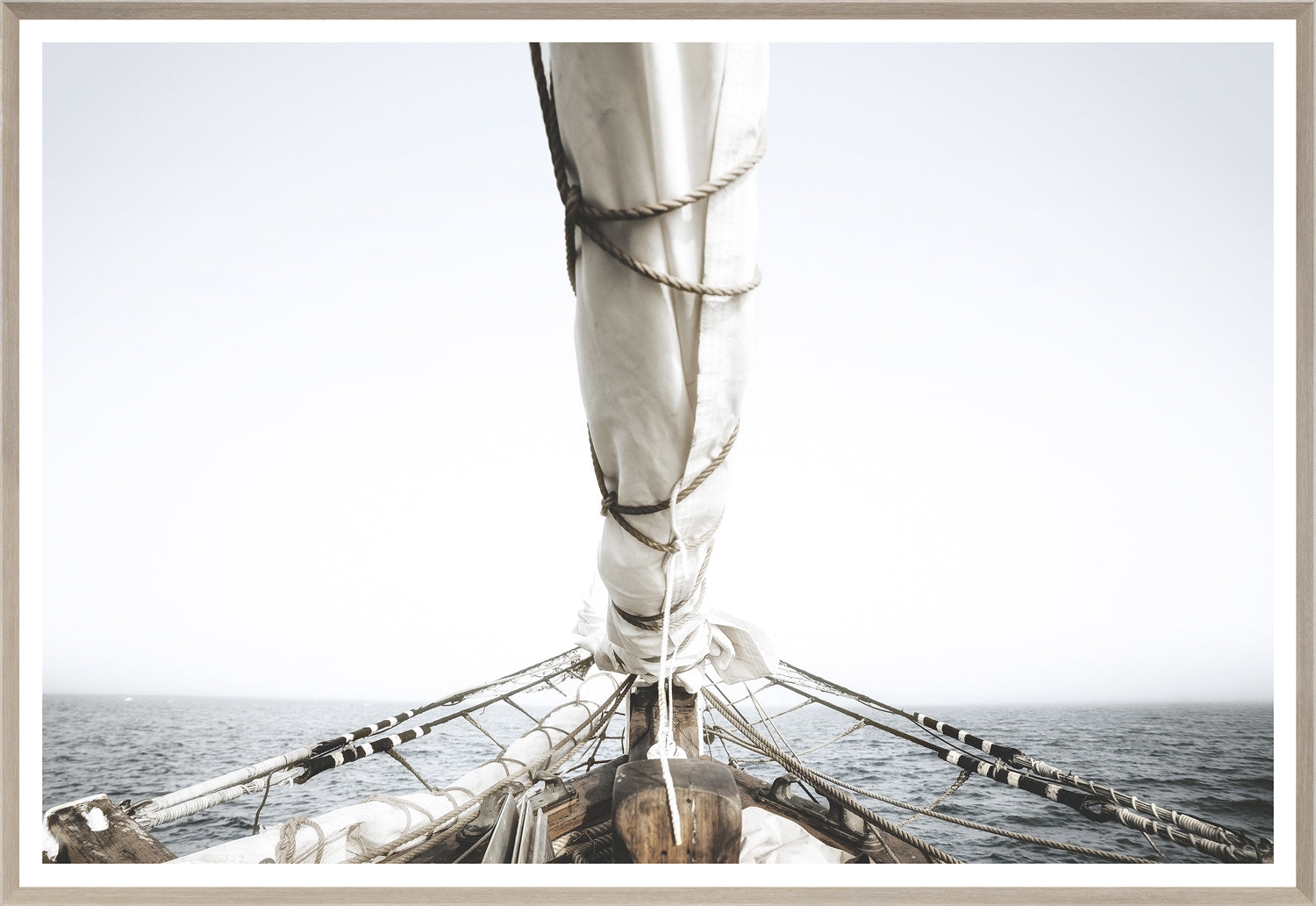 The ocean beckons in this stunning view off the bow of the Schooner “Opal”. Her elegant rigging is contrasted against a misty, wide open sky. Finished in a soft sand toned, contemporary profile.