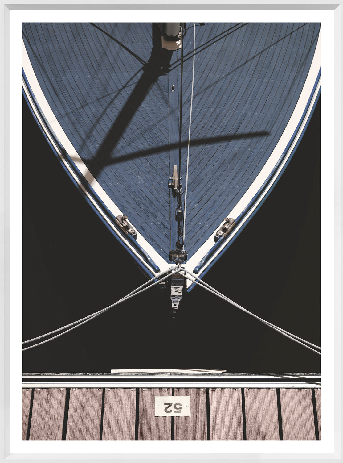 This dramatic photograph of the bow of a boat tied to a wooden dock is stunning. The lines of the white rope which tether the boat to its slip are contrasted with the dark water, coupled with the cool tones resulting in an impressive piece.