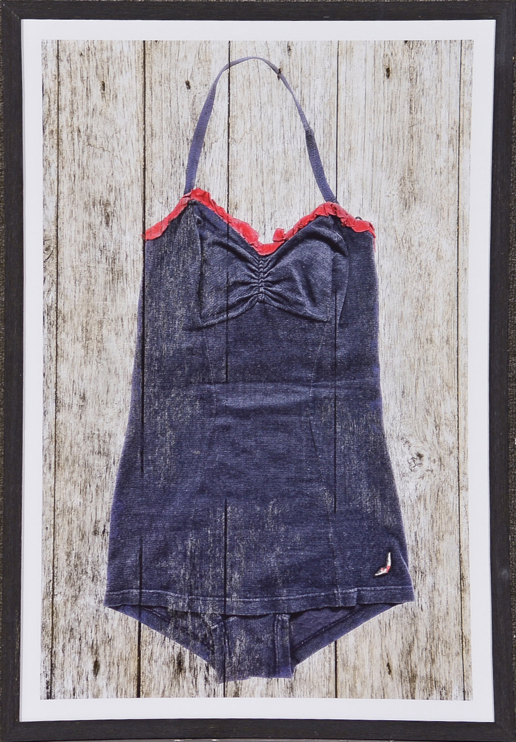 Swimsuits from a bygone era are both charming and whimsical. Can you see yourself in one? A conversation piece for any cottage or retro decor. Set against a rustic board background and a complimentary textured frame.